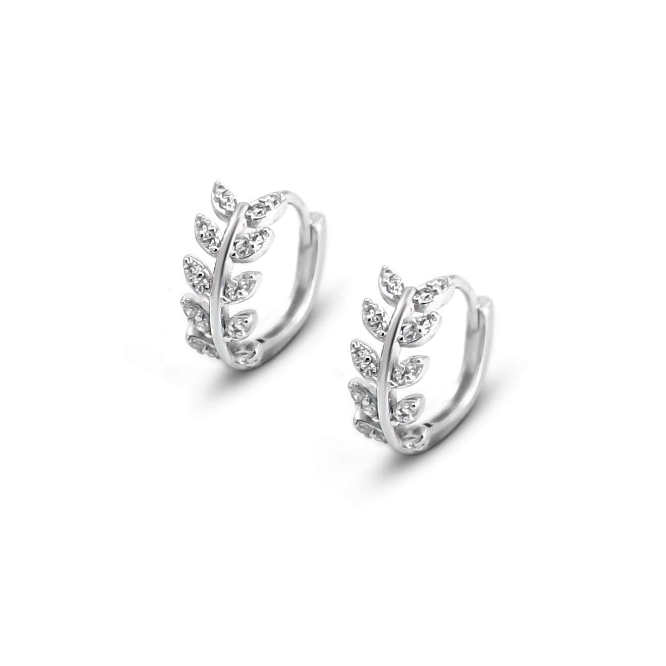 Feine Blatt Creolen - Die hübschesten Huggie Creolen mit funkelnder Blatt Verzierung aus hochwertig rhodiniertem 925er Sterling Silber mit Click-Verschluss und weissen Zirkonia. Perfekt, um deinem Look funkelnde Boho Akzente zu geben. 🌿✨