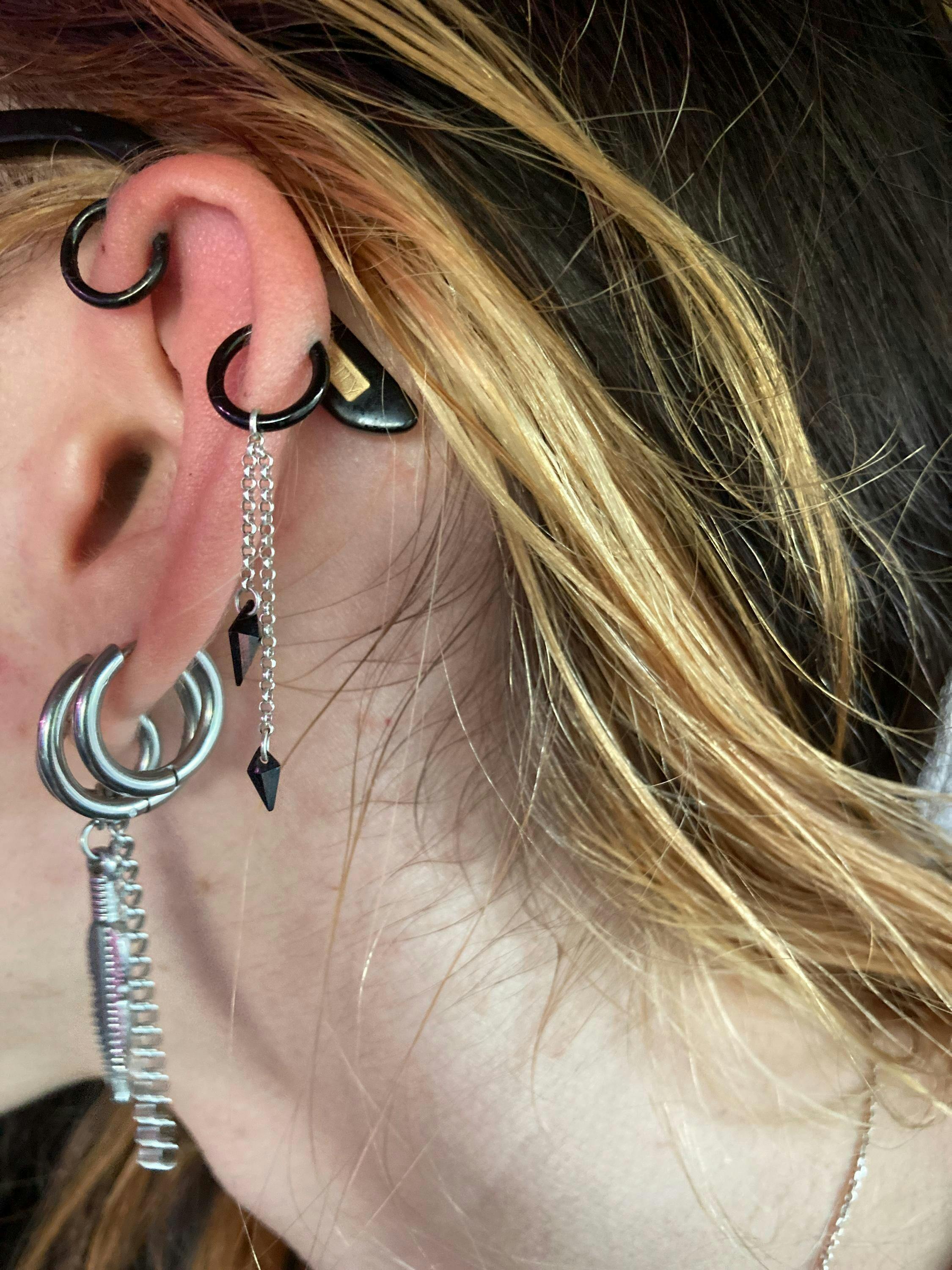 Ohrring Kette Kite Schwarz - Die hübscheste Ohrring Ketten mit 1 oder 2 funkelnden, schwarzen Kite Zirkonia Anhänger aus hochwertigem 925er Sterling Silber (nur Kette mit Anhänger, ohne Ohrring). Mega "In" und perfekt, um deine Ohren zu stylen und schon vorhandenen Ohrringen das gewisse, coole "Etwas" zu geben. Diese wunderschöne Ohrring Ketten lässt sich an jedem herkömmlichen Ohrstecker, feinen Creolen oder Piercing-Stecker bis 18G (1 mm) befestigen und  mit anderen Ohrringen oder Silberschmuck aus unserem Shop kombinieren. Gerne fertigen wir sie auch für Piercings in 16G und grösser, schick uns dazu einfach eine Nachricht. Sie sehen fantastisch an Piercing in Ohrläppchen, Helix oder jedem anderen Piercing aus. Bereit deine Ohren zu stylen?!