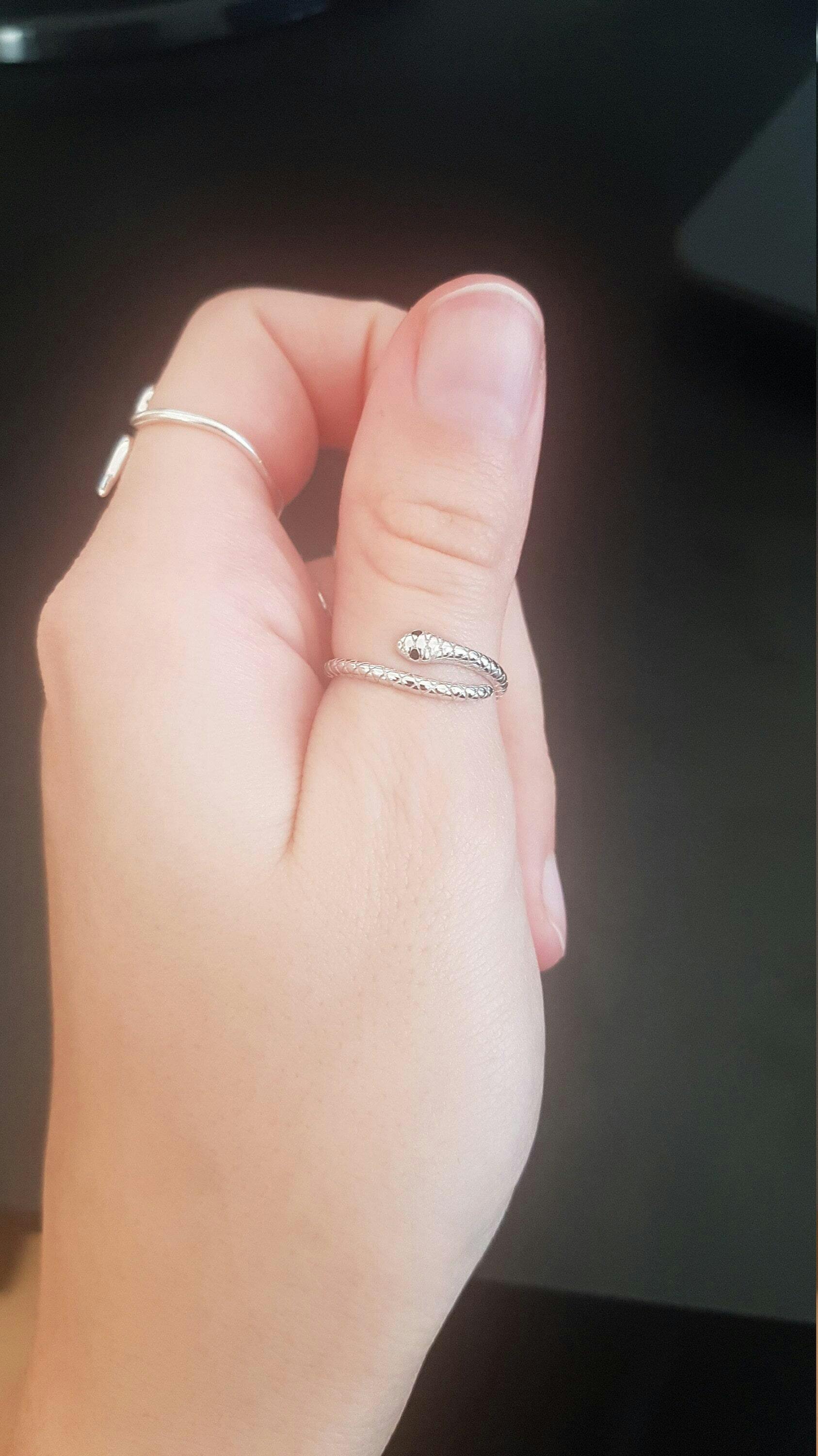 Schlangenring in feinem und wunderschönem Design, super feminin und an deine Finger anpassbar. Unser Schlangenring Bestseller mit funkelnden, schwarzen Zirkonia Augen ist ein absoluter Lieblings-Ring, weil er an jeden deiner Finger passt (deshalb übrigens auch perfekt als Geschenk). Er ist ein einzigartiges Statement Schmuckstück und trotzdem fein genug, damit du ihn zu weiteren Ringen kombinieren kannst. Einzigartiger Schlangenring in Einheitsgröße auch hochwertigem 925 Sterling Silber mit schwarzen Zirkonia Augen. Unverändert hat der Schlangenring ca. die Größe US 7.5 (Umfang: 47,5 mm). Kommt wunderschön verpackt bei dir an.